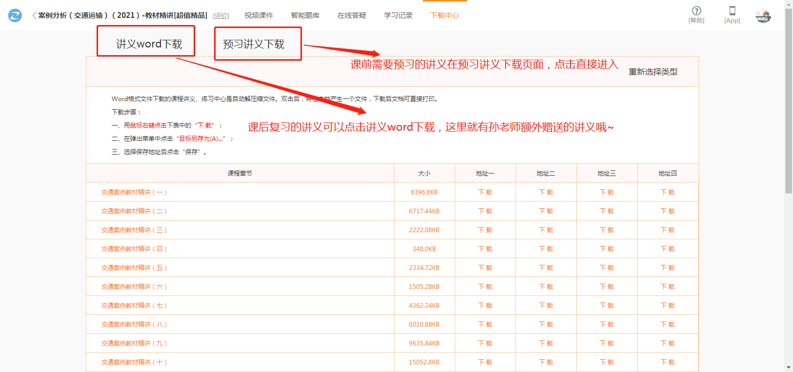 第五步:看到这个页面就安心了,没错就是这个页面,里面有我们这节课所有的讲义!课前需要预习的学员可以在“预习讲义下载”,点击直接进入下载;课后复习的讲义可以点击“讲义word下载”,这里就有孙老师额外赠送的讲义哦~