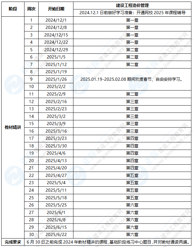 2、已报网校2025年一级造价工程师辅导高效实验、尊享无忧、VIP至尊班的同学,将由系统根据您的入学信息及学习时间智能生成更合理的学习规划,如与本表不一致,请以智能备考方案中的学习计划为准。