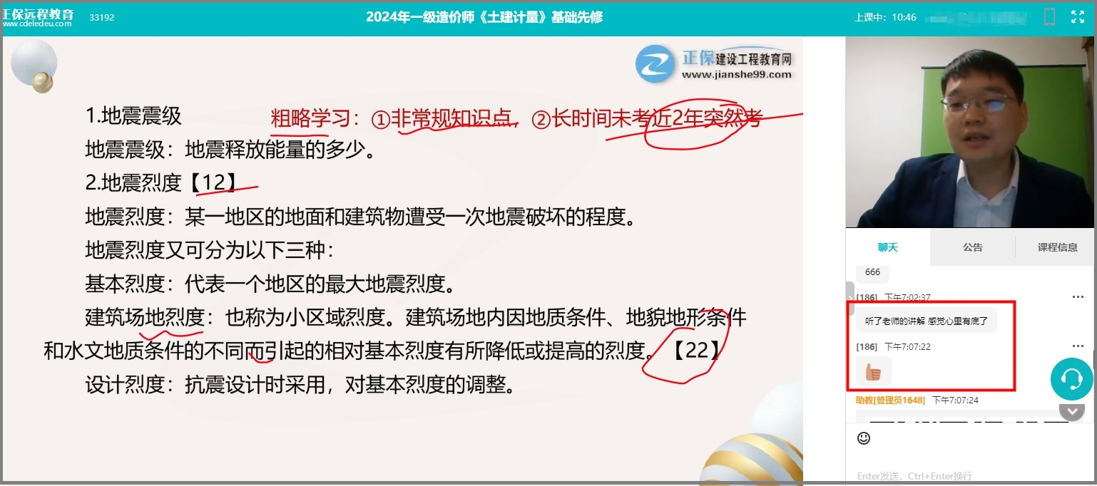 魏霖阳老师在讲课之初为考生讲解了《土建计量》的科目定位、知识框架、分值分布,指出了备考路上的障碍并提出了解决方法,并就学习重点进行揭秘,总结了学习通关三要点。学员听完直呼“心里有底了”!