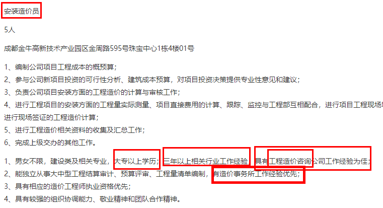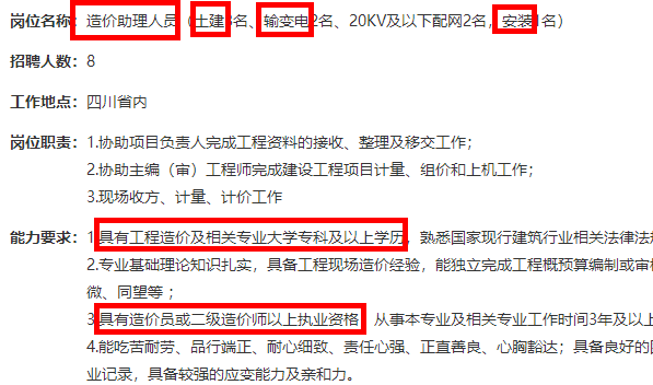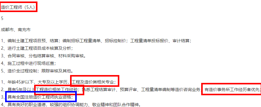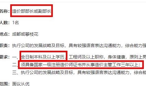 从上面的条件中可以看出,基本上招聘要求都是需要具有造价相关的经验,或者至少需要有二级造价师证书,也有一些直接说明要有一级造价师证书,且待遇优厚。这说明目前一级造价师还是非常稀缺的,市场还是需要大量的人才,所以目前来看一级造价师还是很值得大家去考的,证书含金量也是依然很高。
