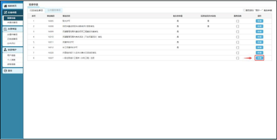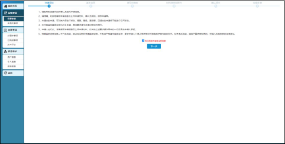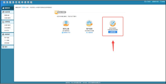 新注册用户进入系统申报页面后,可选择“立即申请”,进行事项申请,也可点击系统左侧菜单栏中在线申请的“我要申请”,进入申请页面后,选择需要申请的事项类型,点击申请按钮。