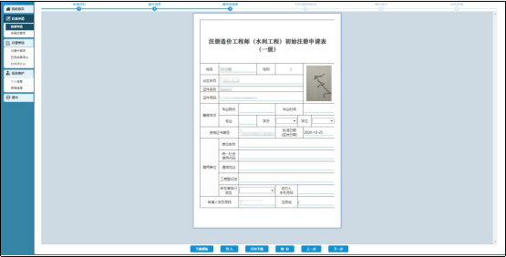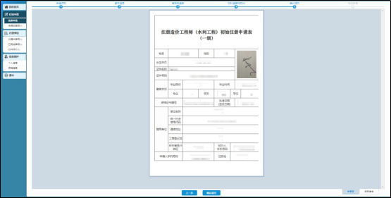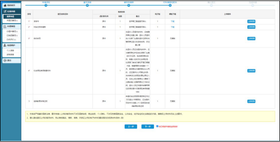 完成填写申请表后,进入材料清单和附件上传步骤,用户可在此上传承诺书、初始注册申请表、劳动合同、社保缴费材料、继续教育合格证明等材料;可上传文件格为 pdf,大小不能超过 500M。若有遗漏材料未上传,系统会提示到具体材料,完成上传后可进行下一步。