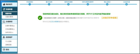 材料附件上传后进入提交确认页面,用户可在此确认申请填报信息,在页面右下角可切换查看已上传的申请表和材料清单,确认无误后可点击确认提交,这时会收到系统提示。