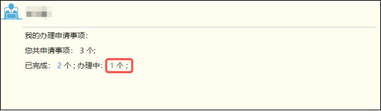 业务办理进度查询共有两种方式,用户可根据自己的使用习惯进行查询。方法一:进入申报首页后,查看左上角的办理事项申请栏将鼠标放到申请事项类型的数字上,点击可跳转页面。