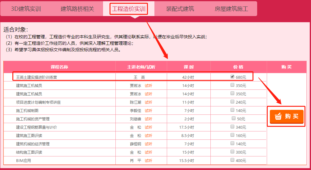 进入建筑实务大讲堂—点击“工程造价实训”—选择“王英土建实操进阶训练营”—购买