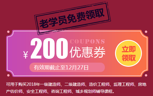 2、已付费学员,赠送200元优惠券,可用于购买2018年一级建造师、二级建造师、造价工程师、监理工程师、房地产估价师、安全工程师、咨询工程师、城乡规划师辅导课程。使用优惠券有效期截止至12月27日。 此优惠券不支持0元购课/0元班次升级,不能与其他优惠券同时使用。 点击领券>>