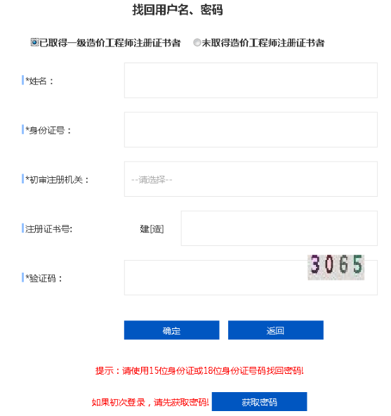 在个人登录页面,选择“获取密码”,通过身份证号/军官号/香港测量师互认证号(任选其一)、证件号获取密码。