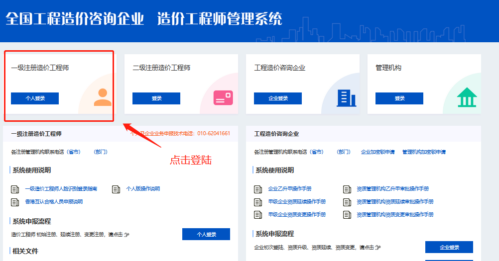 (1) 打开全国造价工程师管理系统,选择“一级造价工程师个人登录”,跳转至国家政务服务平台,选择“个人用户登录” ;