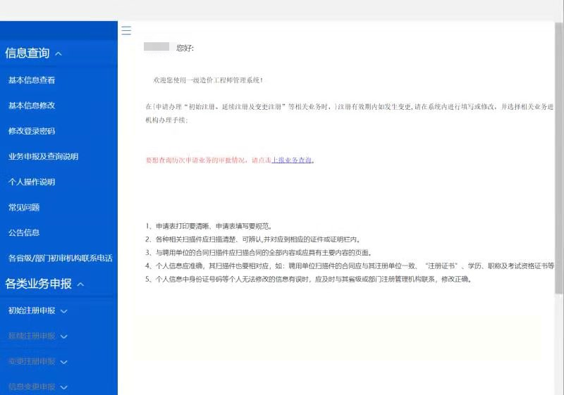 (5)人脸识别认证成功后,进入全国造价工程师管理系统 办理业务。