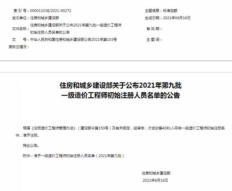 - · 住建部关于公布2024年第十六批一级造价工程师初始注册人员名单的公告