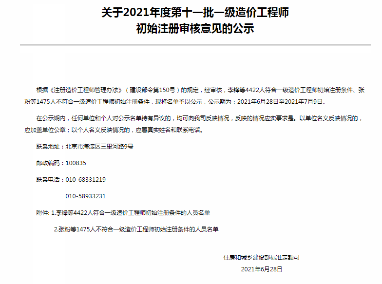 根据《注册造价工程师管理办法》(建设部令第150号)的规定,经审核,李锋等4422人符合一级造价工程师初始注册条件、张粉等1475人不符合一级造价工程师初始注册条件,现将名单予以公示,公示期为:2021年6月28日至2021年7月9日。