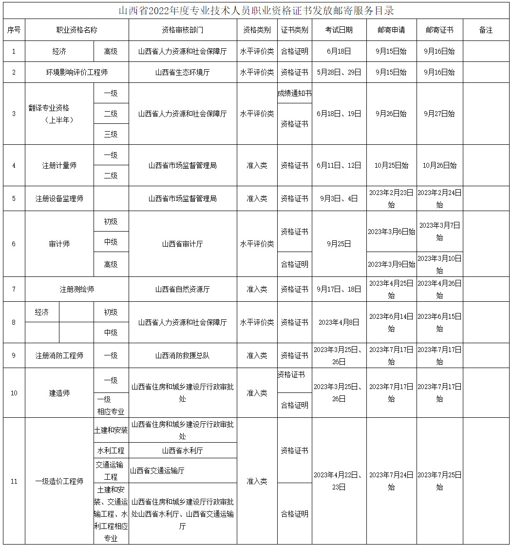 【邮寄目录】山西省2022年度专业技术人员职业资格证书发放邮寄服务目录