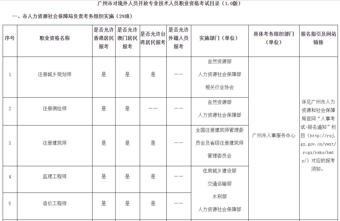 好消息!港澳台的居民也可报考一级造价工程师考试了!广州市人力资源和社会保障局发布了《广州市对境外人员开放专业技术人员职业资格考试目录(1.0版)》,其中涉及造价工程师,具体通知如下。