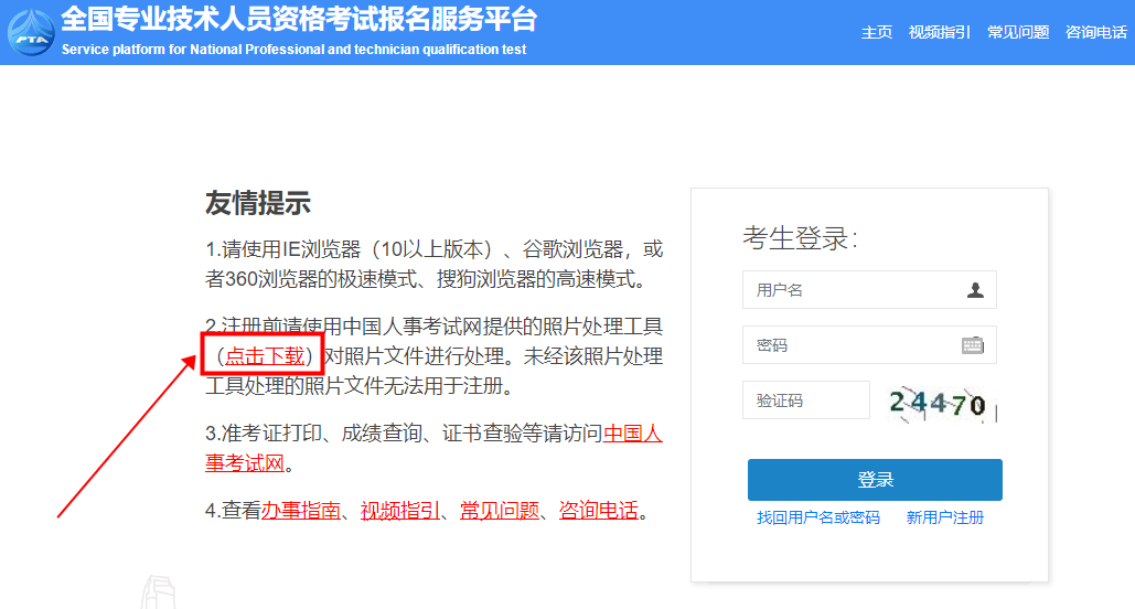 特别提醒:注册前还需下载中国人事考试网提供的照片处理工具对照片文件进行一下处理。未经该照片处理工具处理的照片文件无法用于注册。