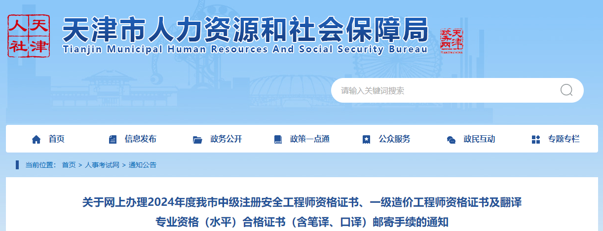 为满足广大考生需要,减少考生往返路程和排队等候,天津市人才考评中心与中国邮政速递物流股份有限公司天津市分公司合作,开通2024年度我市中级注册安全工程师资格证书、一级造价工程师资格证书及翻译专业资格(水平)合格证书(含笔译、口译)邮政EMS寄递业务。具体事项通知如下: