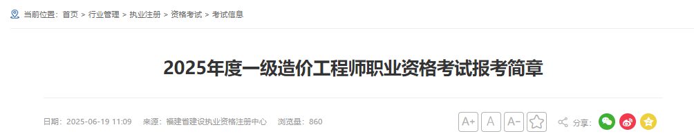 福建省2025年度一级造价工程师职业资格考试报考通知已发布,网上报名时间:2025年6月25日10:00-7月7日10:00;在线核查时间:2025年6月25日10:00-7月7日17:00;网上缴费时间:报考人员通过核查后至7月8日10:00。官方通知内容如下: