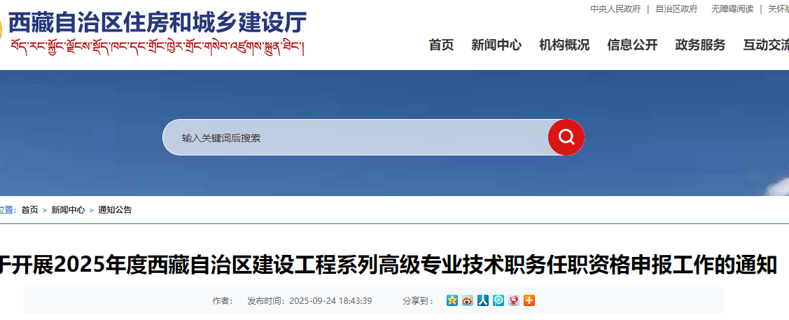 2025年度西藏自治区建设工程系列高级专业技术职务任职资格申报工作的通知已发布,申报截止时间2025年10月24日,逾期不予受理。详细通知如下:
