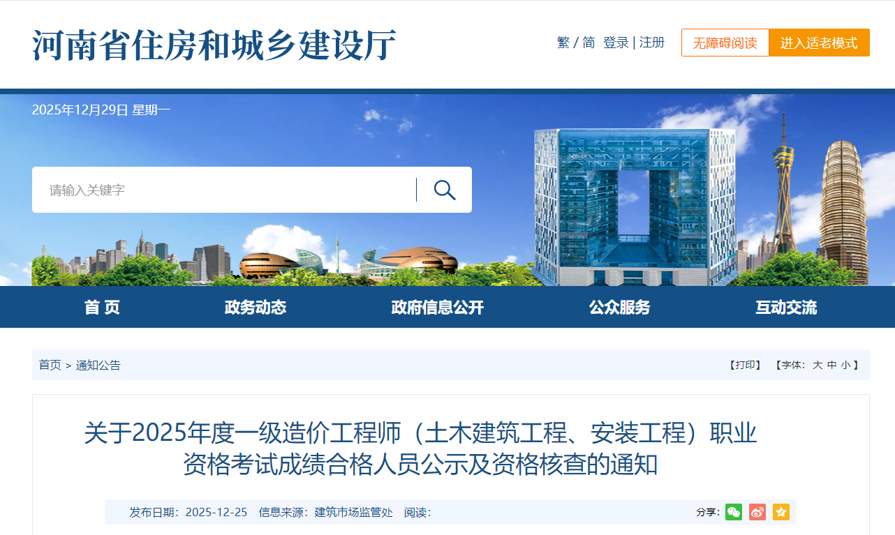 河南省2025年度一级造价工程师(土建、安装)考试成绩合格人员公示及资格核查通知已发布,详情如下:
