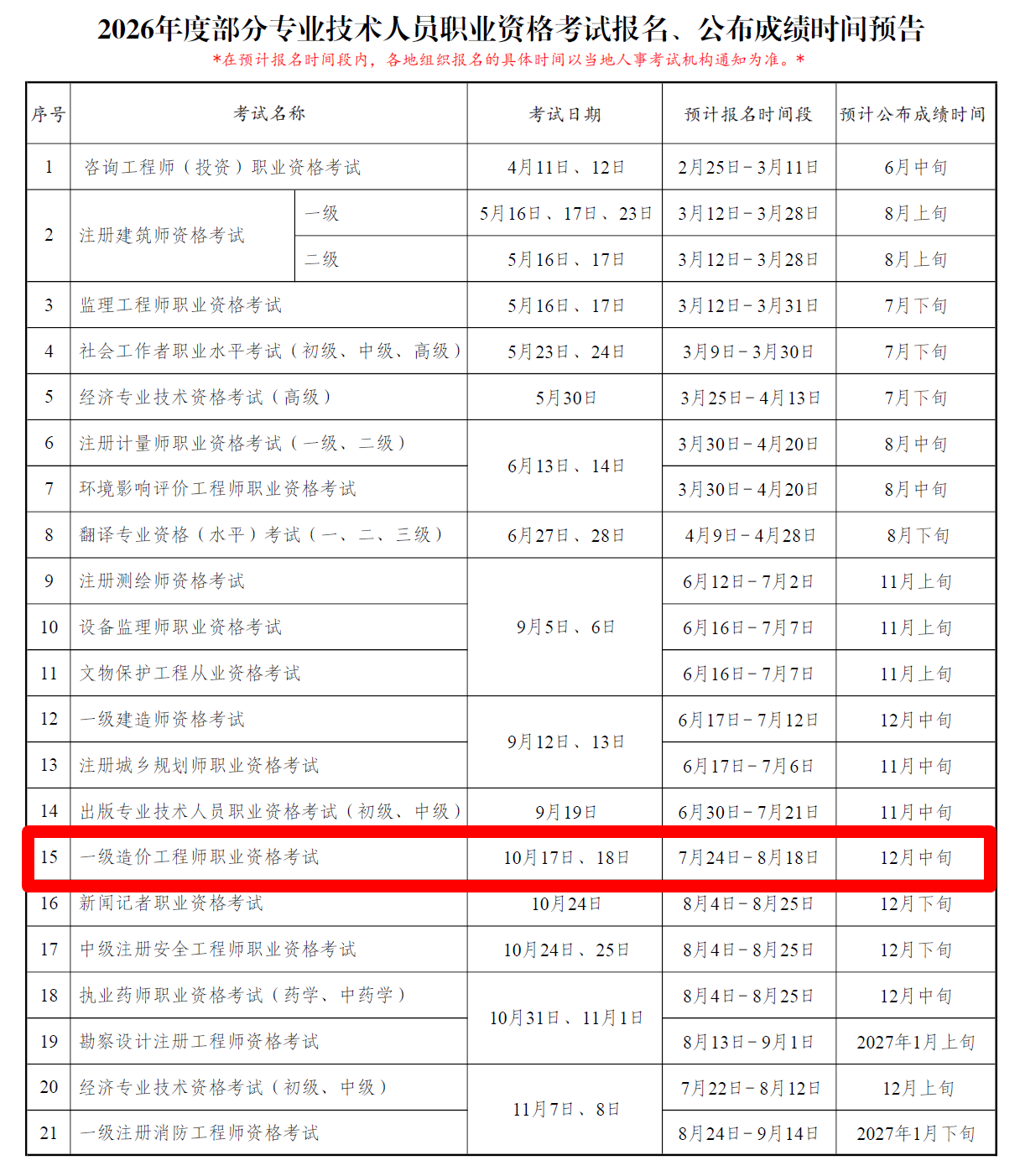 中国人事考试网发布“2026年度专业技术人员职业资格考试重要事项提示”通知,其中通知中表明:2026年全国一级造价师考试预计报名时间7月24日-8月18日;考试时间为10月17、18日;预计成绩公布时间为12月中旬。详细考试一般流程及其他考试安排通知如下: