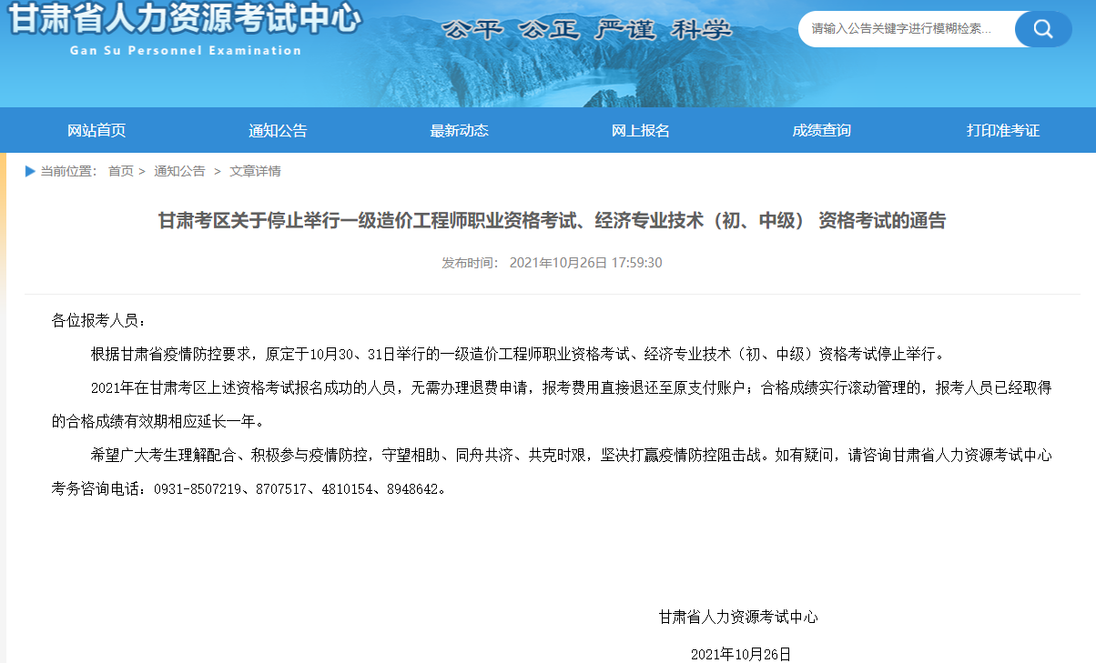 2021年一级造价师考试即将来临,原定甘肃省2021年一级造价师考试时间在2021年10月30日-2021年10月31日,但是因为疫情,甘肃人力资源和社会保障厅订阅号发布2021年一级造价师停考通知,在发布的《甘肃考区关于停止举行一级造价工程师职业资格考试的通告》中提到:原定于10月30、31日举行的一级造价工程师职业资格考试考试停止举行,并且提示2021年在甘肃考区上述资格考试报名成功的人员,无需办理退费申请,报考费用直接退还至原支付账户;合格成绩实行滚动管理的,报考人员已经取得的合格成绩有效期相应延长一年。