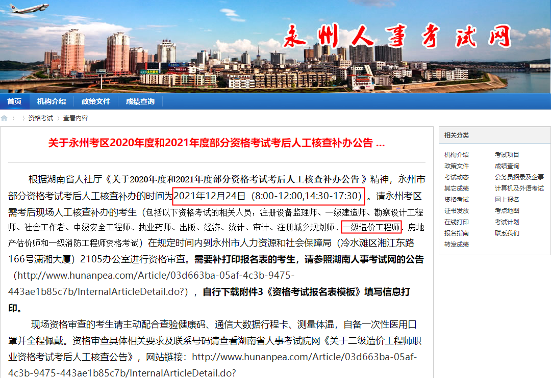 2021年12月10日10点53分,湖南省永州人事考试网发布了《关于永州考区2020年度和2021年度部分资格考试考后人工核查补办公告》,公告中提及了这样一个时间——永州市一级造价师考试考后人工核查补办的时间为2021年12月24日(8:00-12:00,14:30-17:30)。