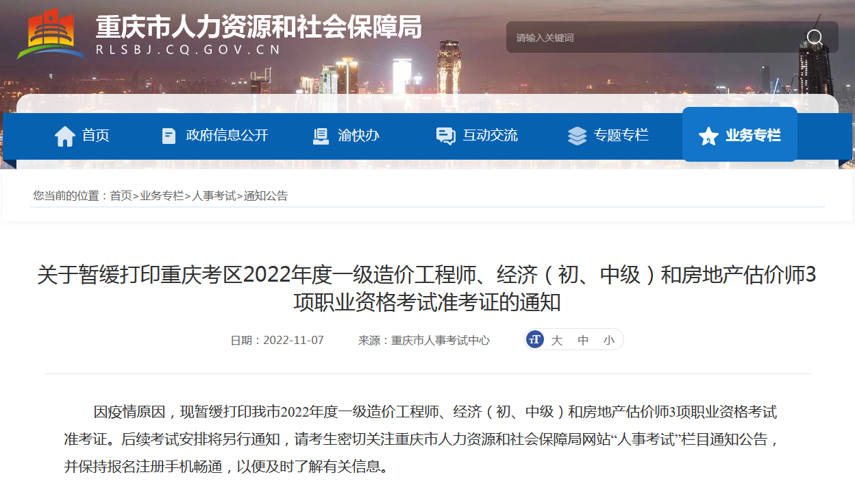 关于暂缓打印重庆考区2022年度一级造价工程师、经济(初、中级)和房地产估价师3项职业资格考试准考证的通知