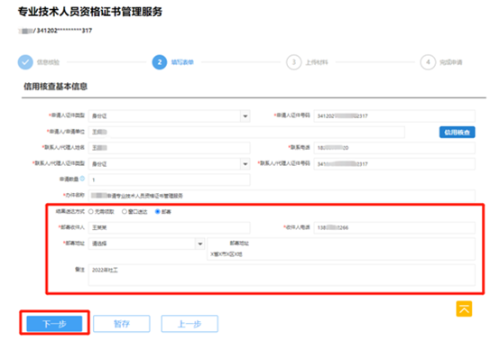 3.在“结果送达方式”中选择“邮寄”,完善邮寄收件人姓名、电话、地址等信息,在“备注”栏填写拟申领证书的考试年度和名称,如“2022年社工”点击“下一步”,最后在跳转的页面中点击“提交申请”即可完成。