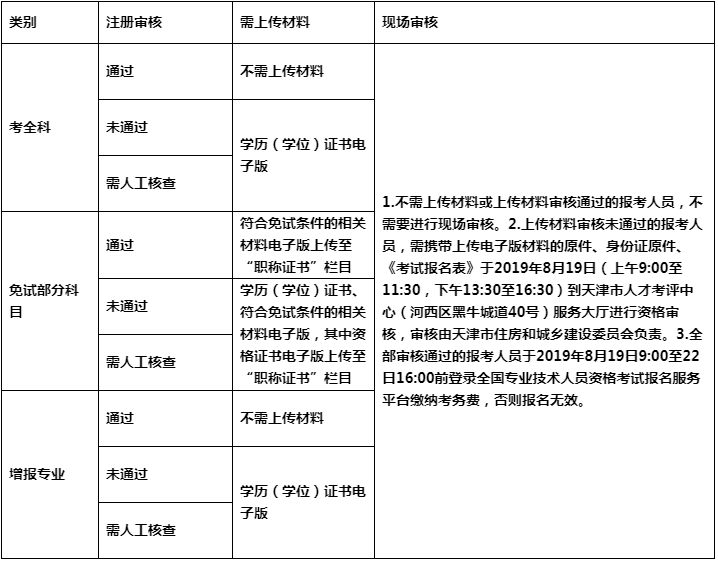 备注:(1)2019年8月6日9:00至8月15日16:00登录全国专业技术人员资格考试报名服务平台进行上传相关资料电子版,审核部门将于2019年8月12日9:00开始对上传材料进行审核。