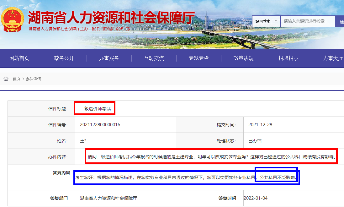 有学员对一级造价师考试变更专业科目,其他科目是否受影响问题向湖南人力资源和社会保障厅提问,已得到回复,具体如下: