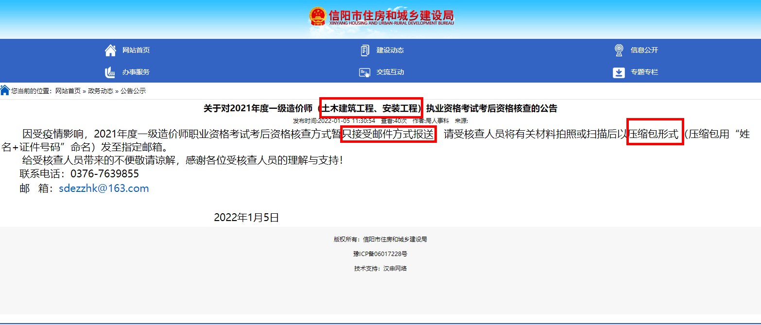 因受疫情影响,2021年度一级造价师职业资格考试考后资格核查方式暂只接受邮件方式报送,请受核查人员将有关材料拍照或扫描后以压缩包形式(压缩包用“姓名+证件号码”命名)发至指定邮箱。
