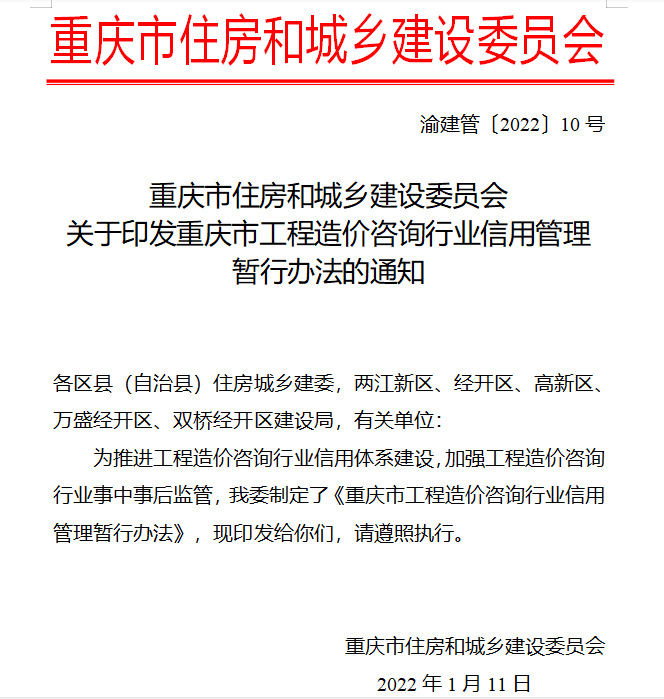 为推进工程造价咨询行业信用体系建设,加强工程造价咨询行业事中事后监管,我委制定了《重庆市工程造价咨询行业信用管理暂行办法》,现印发给你们,请遵照执行。