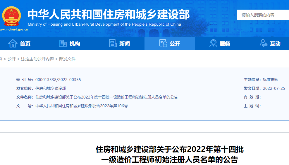 住建厅公布2022年第十四批 一级造价工程师初始注册人员名单的公告