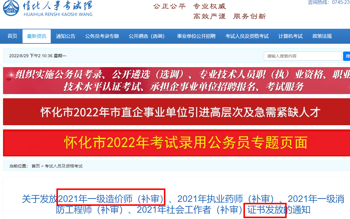 2021年一级造价师(补审)、2021年执业药师(补审)、2021年一级消防工程师(补审)、2021年社会工作者(补审)证书已经开始发放(名单见附件),为切实提高考试服务水平,方便广大考生,上述职业资格证书除现场领取证书服务外,同时提供证书邮寄网上申请服务,考生可自主选择。现场领取证书的考生请携带身份证原件到怀化市政务服务中心C栋一楼15号窗口领取证书;证书邮寄网上申请的通过手机微信客户端扫描下方二维码,关注“湖南省公务员考试测评中心”微信服务号,进入“考生服务”—“我的证书”栏目按系统提示操作进行申请邮寄证书。