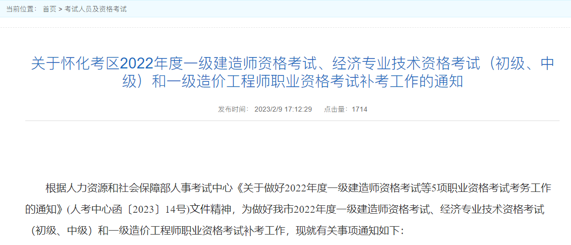 关于怀化考区2022年度一级建造师资格考试、经济专业技术资格考试(初级、中级)