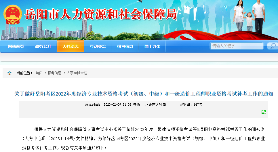 根据人力资源和社会保障部人事考试中心《关于做好2022年度一级建造师资格考试等5项职业资格考试考务工作的通知》(人考中心函〔2023〕14号)文件精神,为做好岳阳考区2022年度经济专业技术资格考试(初级、中级)和一级造价工程师职业资格考试补考工作,现就有关事项通知如下: