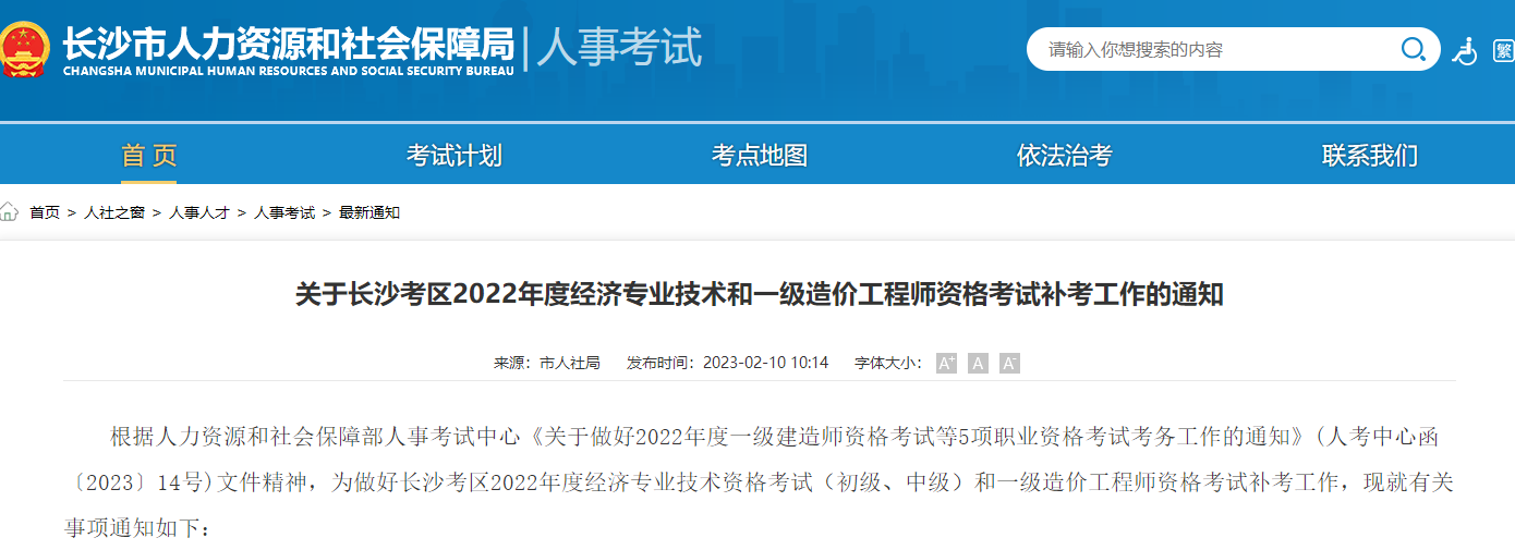 根据人力资源和社会保障部人事考试中心《关于做好2022年度一级建造师资格考试等5项职业资格考试考务工作的通知》(人考中心函〔2023〕14号)文件精神,为做好长沙考区2022年度经济专业技术资格考试(初级、中级)和一级造价工程师资格考试补考工作,现就有关事项通知如下: