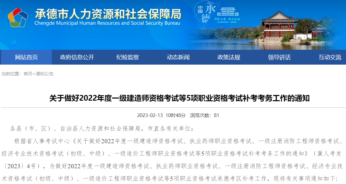 根据省人事考试中心《关于做好2022年度一级建造师资格考试、执业药师职业资格考试、一级注册消防工程师资格考试、经济专业技术资格考试(初级、中级)、一级造价工程师职业资格考试等5项职业资格考试补考考务工作的通知》(冀人考发〔2023〕4号),为做好2022年度一级建造师资格考试、执业药师职业资格考试、一级注册消防工程师资格考试、经济专业技术资格考试(初级、中级)、一级造价工程师职业资格考试等5项职业资格考试承德考区补考工作,现将有关事项通知如下:
