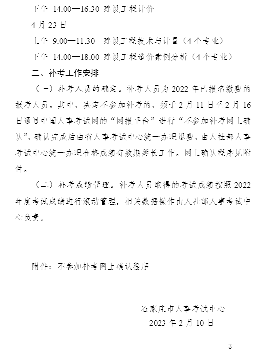 石家庄市人力资源和社会保障局发布《关于做好2022年度一级建造师资格考试、执业药师职业资格考试、一级注册消防工程师资格考试、经济专业技术资格考试(初级、中级)、一级造价工程师职业资格考试等5项职业资格考试补考考务工作的通知》,其中2022年一级造价师决定不参加补考的,须于2月11日至2月16日通过中国人事考试网的“网报平台”进行“不参加补考网上确认”,详情如下:
