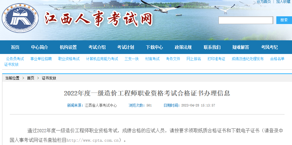 江西人事考试网发布《2022年度一级造价工程师职业资格考试合格证书办理信息》,请按要求领取纸质合格证书和下载电子证书,详情如下: