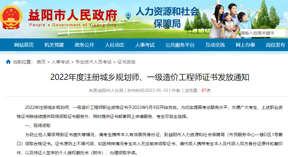 益阳市人力资源和社会保障局发布《2022年度注册城乡规划师、一级造价工程师证书发放通知》,其中包含一级造价师,领取方式为现场或邮寄,详情如下: