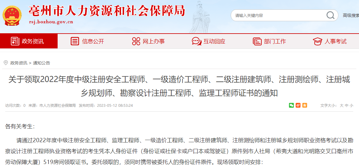 安徽亳州关于领取2022年一级造价工程师证书的通知