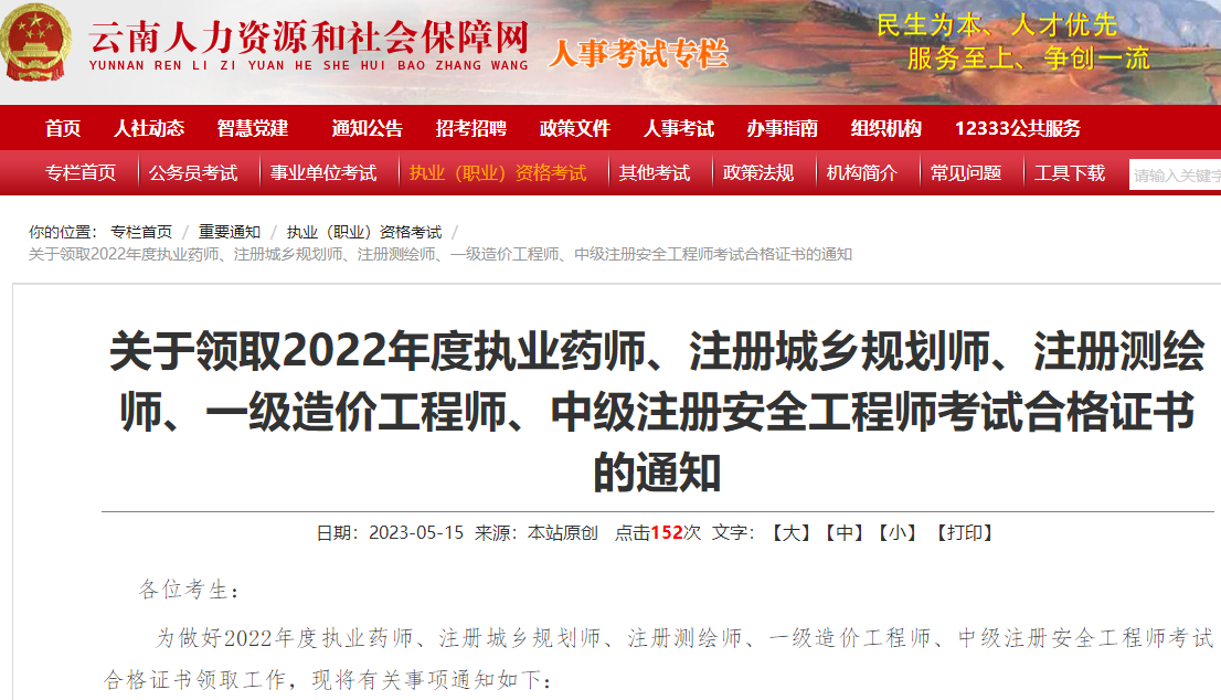 云南关于领取2022年一级造价工程师考试合格证书的通知