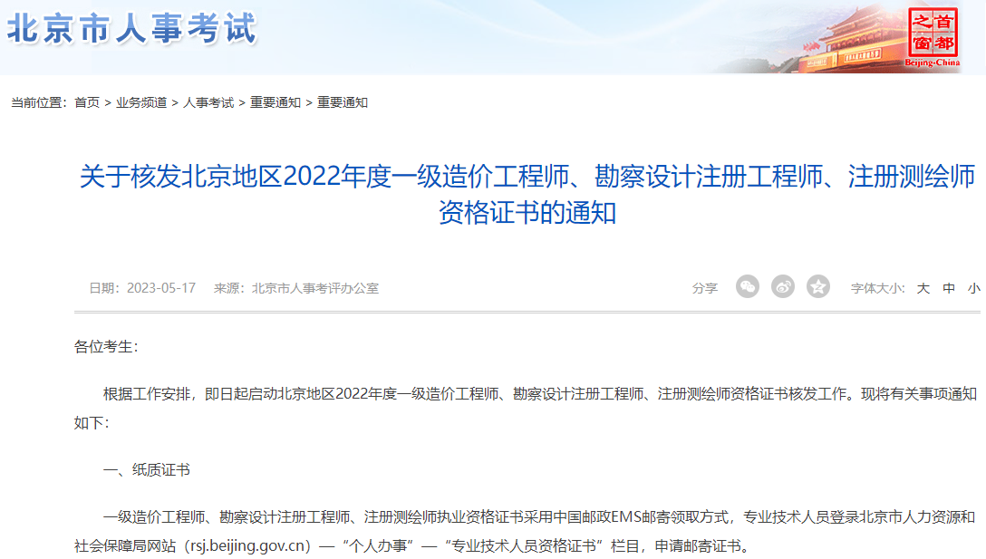 北京市人力资源和社会保障局发布《关于核发北京地区2022年度一级造价工程师、勘察设计注册工程师、注册测绘师资格证书的通知》,其中包含一级造价师,领取方式为邮寄,详情如下: