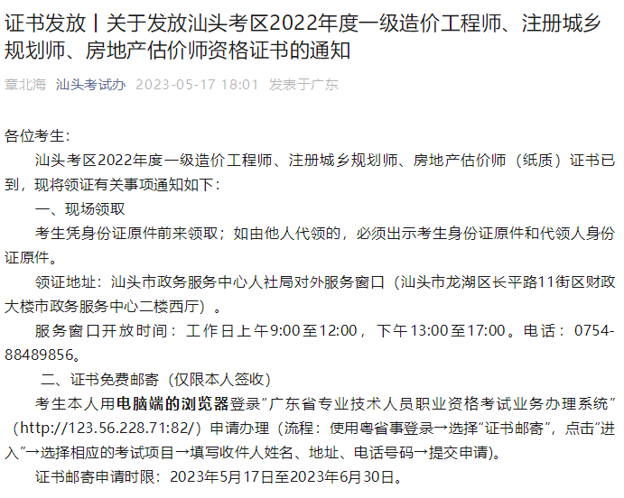 汕头考试办发布《关于发放汕头考区2022年度一级造价工程师、注册城乡规划师、房地产估价师资格证书的通知》,其中包含一级造价师,领取方式为现场或者邮寄,详情如下: