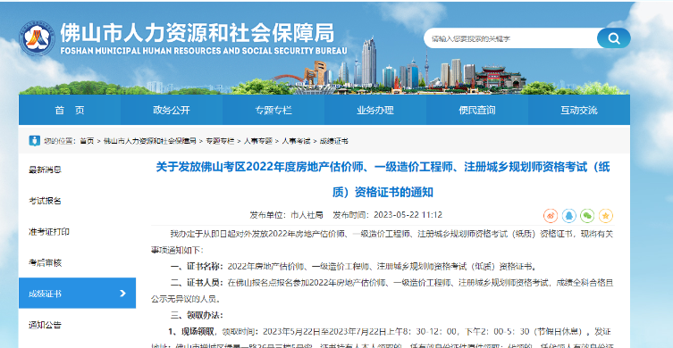 广东佛山关于发放2022年度一级造价工程师专业技术资格证书的通知