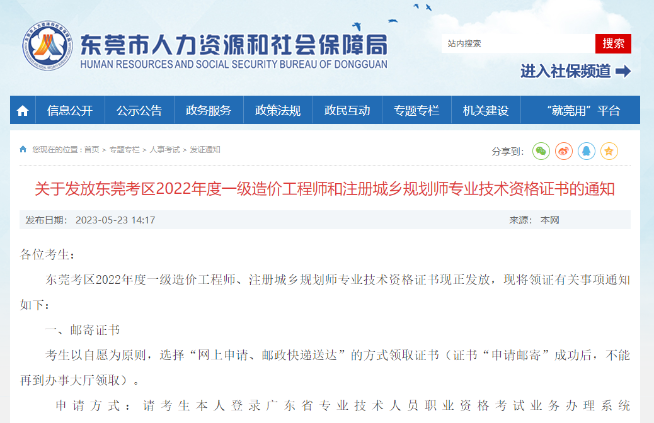 东莞市人力资源与社会保障局发布了《关于发放东莞考区2022年度一级造价工程师和注册城乡规划师专业技术资格证书的通知》,包含一级造价工程师领证有关事项通知。详情如下: