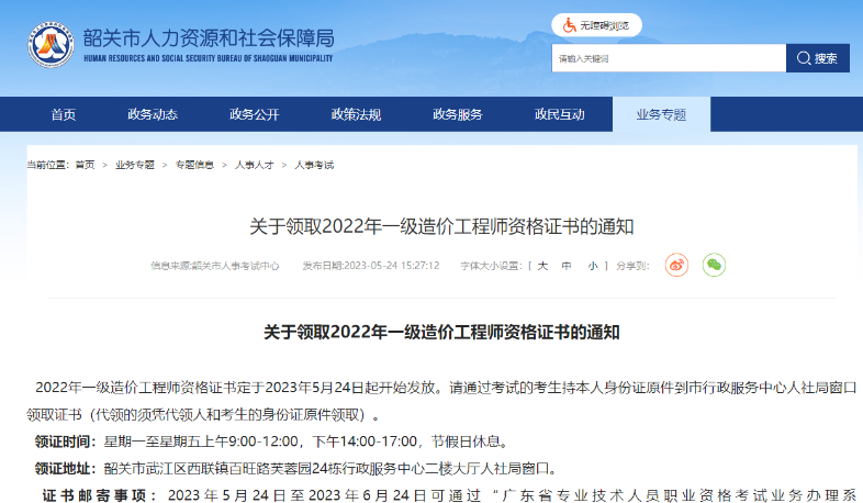 韶关市人力资源和社会保障局发布了《关于领取2022年一级造价工程师资格证书的通知》,包含一级造价工程师证书领取相关事宜,详情如下:
