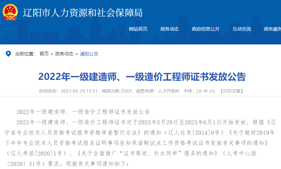辽宁辽阳2022年一级造价工程师证书发放公告