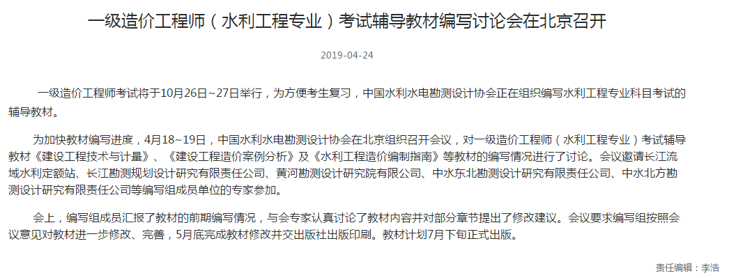 中国水利水电勘测设计协会:一级造价师教材计划7月下旬正式出版