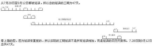 该工程的实际工期延误为47天,即为从7月28日到9月12日总的持续时间。参见下图: